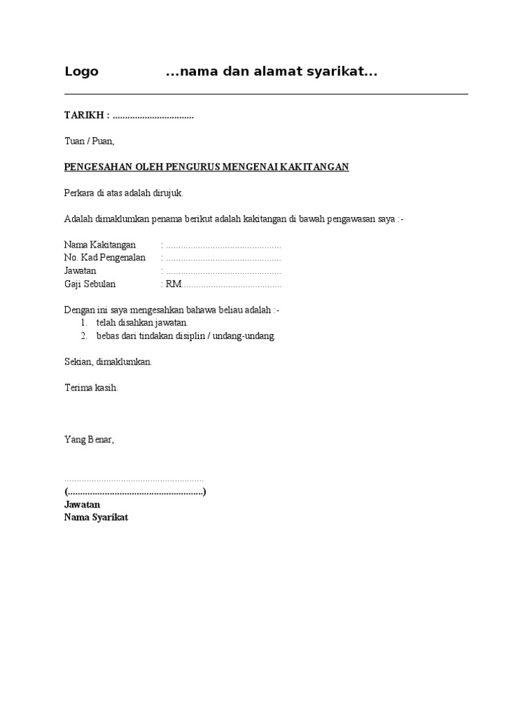 Text of contoh surat pengesahan majikan. Contoh surat pernyataan bukan pengurus partai politik, bagi mereka yang ingin mencalonkan diri untuk diangkat menjadi kepala kelurahan di lingkungan. Oleh rina hayatidiposting pada 8 juni 20208 juni 2020. Tuan / puan, pengesahan oleh pengurus mengenai kakitangan perkara di atas adalah dirujuk. Contoh lembar pengesahan merupakan bagian terluar dari sebuah karya tulis yang berguna untuk penjelasan antara rekomendasi dan tulisan/karya yang dibuat. Bagi anda yang memerlukan contoh surat pembentukan, penetapan dan pengesahan pengurus kelompok tani (poktan), saya lampirkan contohnya dibawah ini: Contoh lembar pengesahan laporan praktikum. Contoh surat keputusan tentang pengangkatan pengurus taman pendidikan al qur'an ( tpq / tpa ) dengan susunan pengurus mengacu kepada buku standar nasional pelaksanaan tpq terbitan. Pengurus (nama syarikat) (alamat syarikat)tuan, per: 2.1 apa itu pengesahan majikan ? Lembar pengesahan, kata pengantar, dan daftar isi. Express design yang bertapak di kelantan merupakan sebuah syarikat atau pengusahaan percetakan baju. 1 (satu) berkas hal :